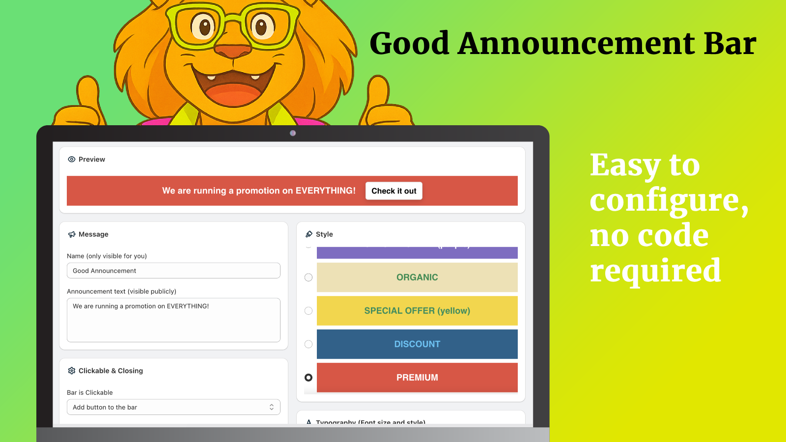Keeping your customers informed about the latest deals, updates, and product-specific news is crucial for growing your business. Good Announcement Bar makes this simple. With just a few clicks, you can create unique, fully customizable announcement bars tailored to your brand and products. Highlight storewide sales, product launches, or location-based promotions in real time.
