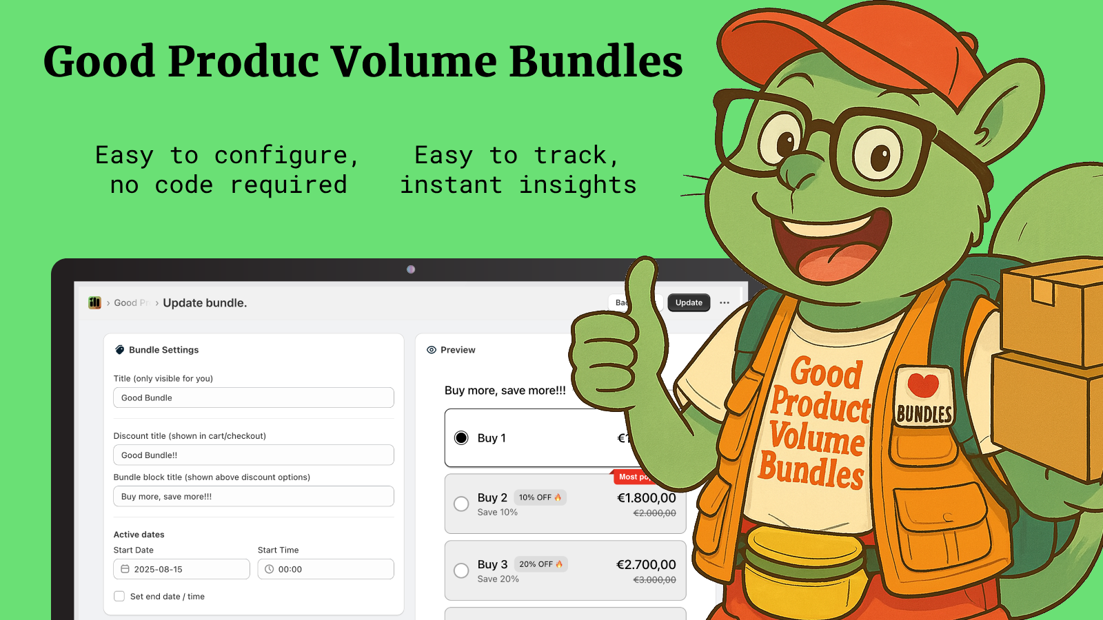 Good Product Bundles is the easiest way to reward customers who buy more. Our app empowers you to set up volume bundles and tiered discounts—so when customers purchase more items in one order, they save more, and you sell more.